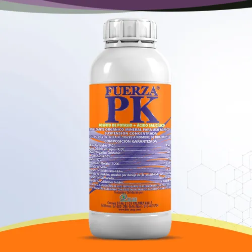 FOSFITO DE POTASIO + ÁCIDO SALICÍLICO FUERZA PK fosfito de potasio potencializado con Ácido Salicílico; su formulación es un compuesto resultante de la reacción química del ácido fosforoso. Activa los procesos metabólicos y también fisiológicos de la planta.